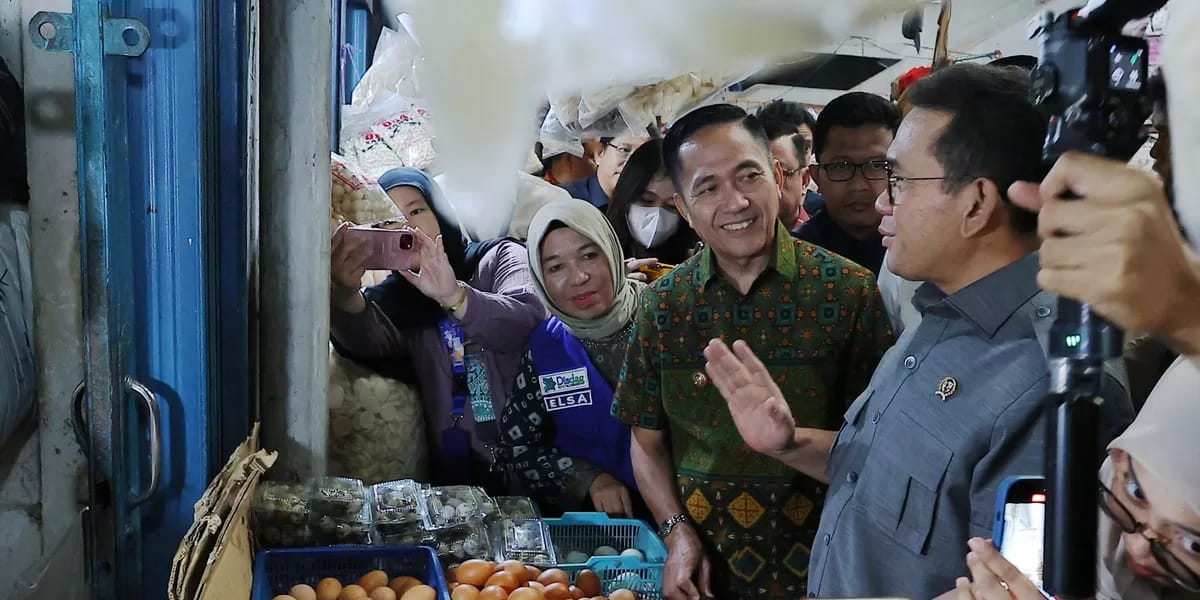 Menteri Perdagangan Budi Santoso bersama Wali Kota Ratu Dewa berkeliling pasar, meninjau langsung sejumlah lapak pedagang, serta berdialog untuk menyerap aspirasi dan mengetahui kondisi harga terkini.
