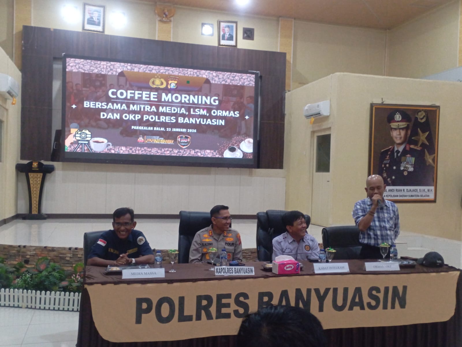 MEDIAPAGI.CO.ID, Banyuasin — Kapolres Banyuasin, AKBP. Risnan aldino. S. IK, M. di Didampingi Kasat Intel Polres Banyuasin, Kasatreskrim Polres Banyuasin, Kadiv Humas Polres Banyuasin, Mengundang Seluruh wartawan yang ada di Kabupaten Banyuasin, selain itu. Hadir juga dalam undangan para Ketua serta pengurus Organisasi ormas, Organisasi Kepemudaan dan Mahasiswa.