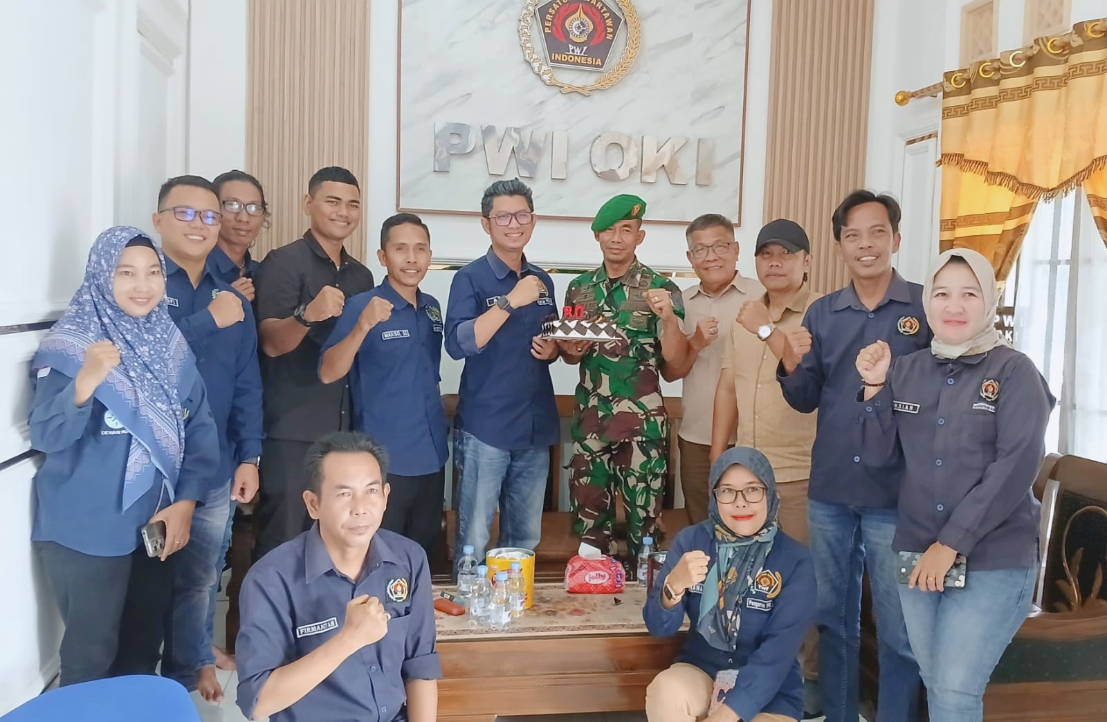 Suasana penuh keakraban dan kekeluargaan terasa saat rombongan Kodim 0402/OKI menyerahkan kue ulang tahun PWI ke-80 sebagai bentuk apresiasi dan penghormatan terhadap insan pers, khususnya PWI di Kabupaten Ogan Komering Ilir.