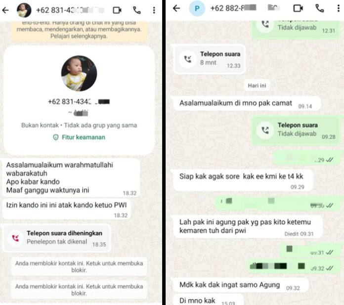 Sejumlah pejabat mengaku kerap menerima pesan singkat hingga panggilan melalui aplikasi WhatsApp (WA) dari oknum yang mengatasnamakan diri sebagai anggota PWI. Oknum tersebut diduga membawa nama organisasi wartawan tertua di Indonesia untuk meminta berbagai kepentingan tertentu.