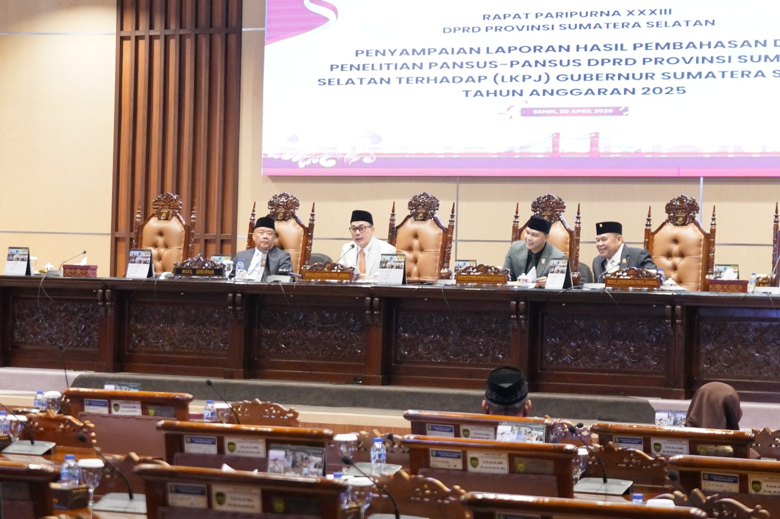 MEDIAPAGI.CO.ID, PALEMBANG – DPRD Provinsi Sumatera Selatan menggelar Rapat Paripurna XXXIII dengan agenda penyampaian laporan hasil pembahasan dan penelitian lima Panitia Khusus (Pansus) terhadap Laporan Keterangan Pertanggungjawaban (LKPJ) Gubernur Sumsel Tahun Anggaran 2025, Senin (20/4/2026), di ruang rapat paripurna DPRD Sumsel.