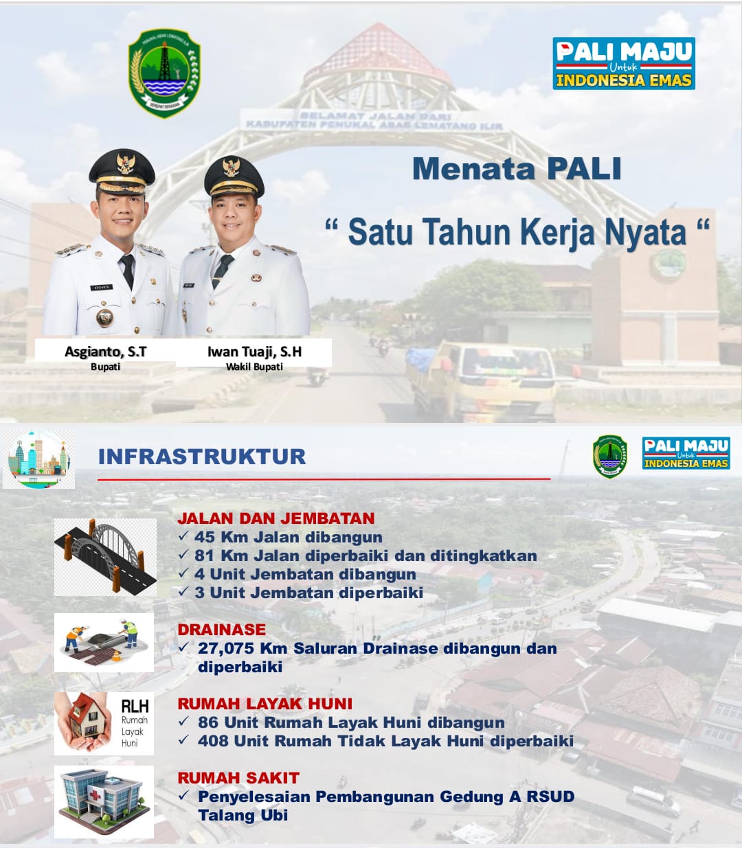 Tak hanya itu, dalam satu tahun kerja, Asgianto-Iwan Tuaji berupaya keras menata kabupaten PALI dalam mewujudkan visi misinya yakni PALI Maju untuk Indonesia Emas.