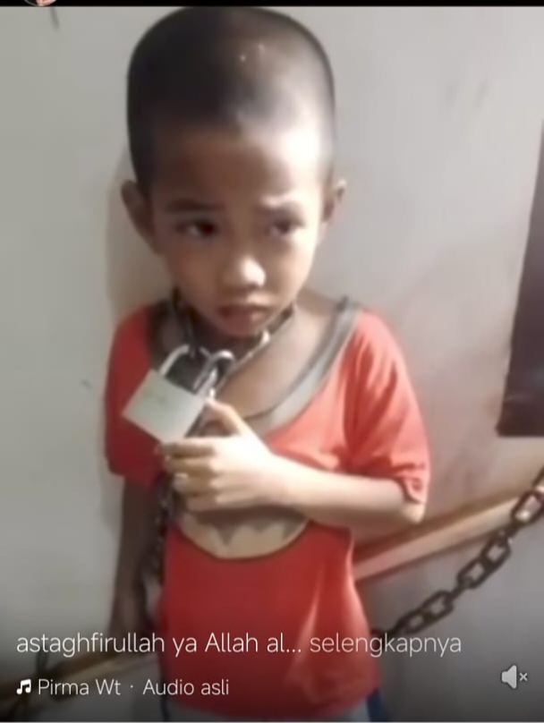 Dalam rekaman video tersebut, seorang bicah laki – laki terlihat terpasung dengan rantai besi dan gembok dalam kondisi sangat ketakutan.