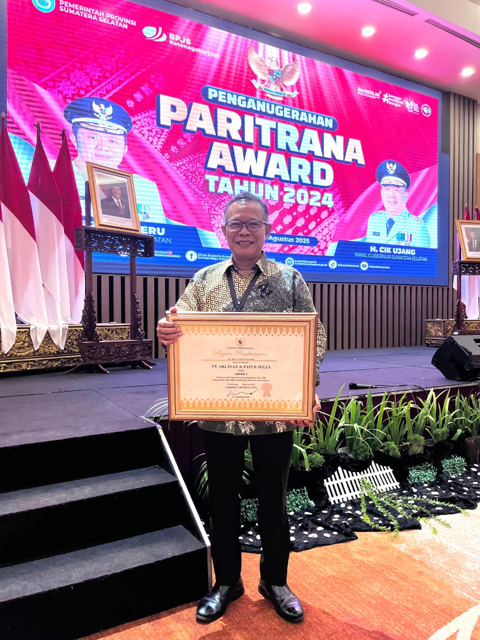 MEDIAPAGI.CO.ID, Sumatera Selatan – PT OKI Pulp & Paper Mills pada hari ini resmi meraih Juara 1 Paritrana Award Tingkat Provinsi Sumatera Selatan Tahun 2024 untuk kategori Badan Usaha Sektor Pertambangan, Manufaktur, dan Konstruksi. Penghargaan bergengsi ini diserahkan langsung oleh Gubernur Sumatera Selatan, DR. H. Herman Deru, S.H., M.M., dalam acara penghargaan yang digelar di Hotel Arya Duta Sumatera Selatan.(27/8/2025).