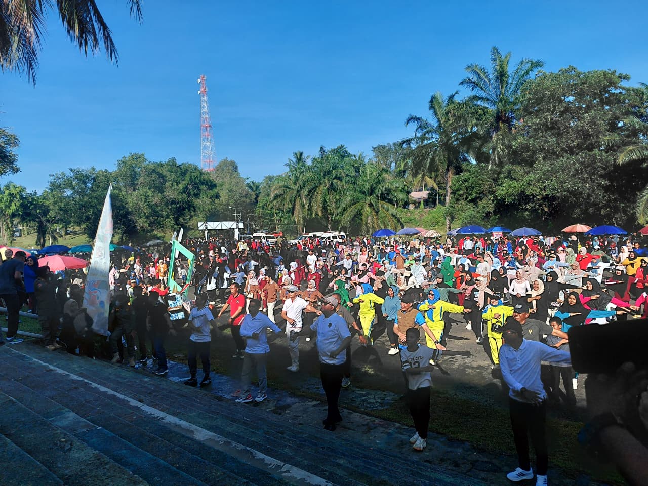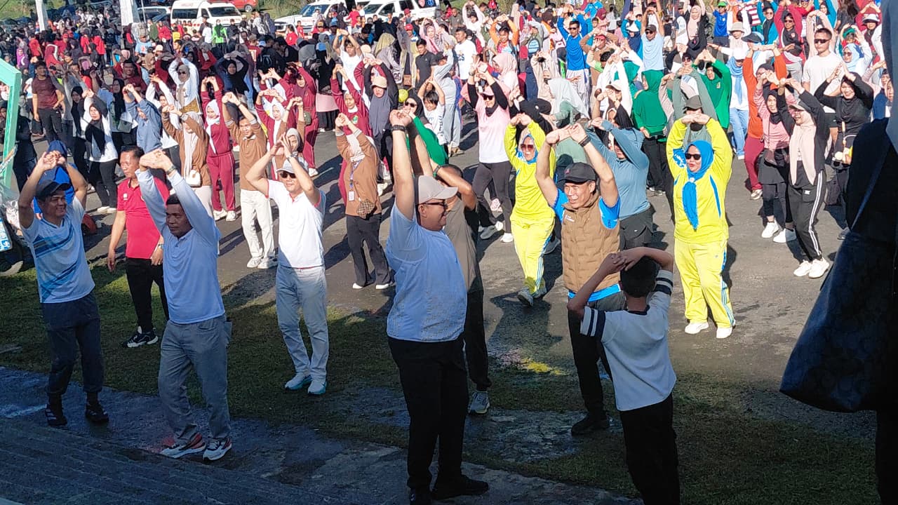 Usai jalan santai, acara dilanjutkan dengan senam sehat bersama. Para peserta dengan penuh semangat mengikuti setiap gerakan, menciptakan suasana kebersamaan yang hangat dalam momentum peringatan hari jadi Kabupaten PALI.